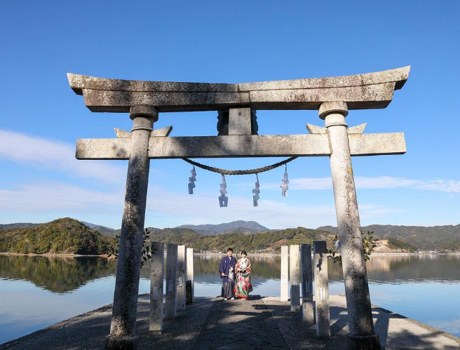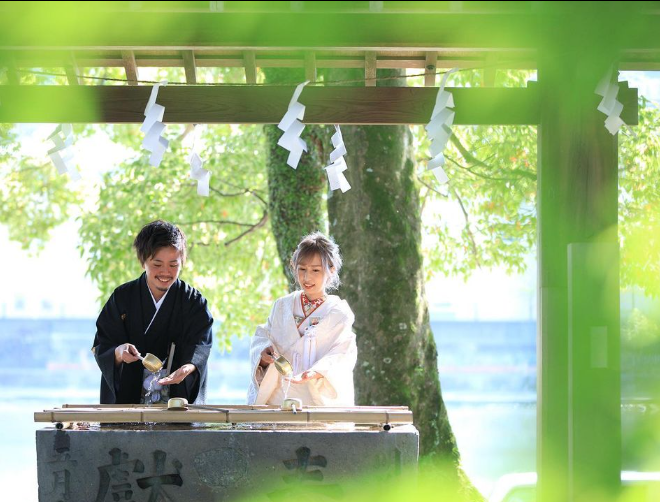 深い緑の中、鳥居の下で、鏡川を背景に…神社ならではの凛とした空気も、自然の中のナチュラルな雰囲気も漂う場所です。