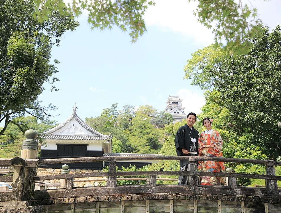 築城400年を超える高知城。天守だけではなく重厚な追手門、緻密に積み上げられた石垣など和装が映えるスポットがたくさんあります。