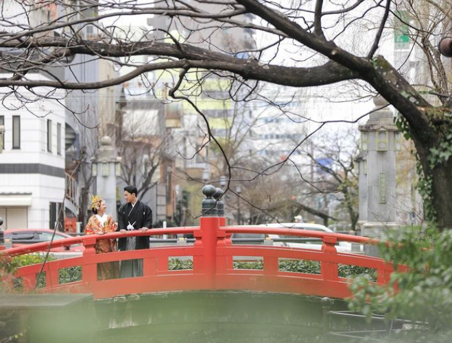 高知の中心地はりまや橋。赤い桁橋(けたばし)も、石造りの欄干も和装姿が美しく映えます。高知らしい一枚に。